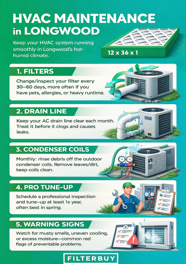 Best cadence: Schedule professional AC maintenance 2× per year (spring + fall). Longwood’s humidity and long cooling season make “once a year” easy to outgrow.